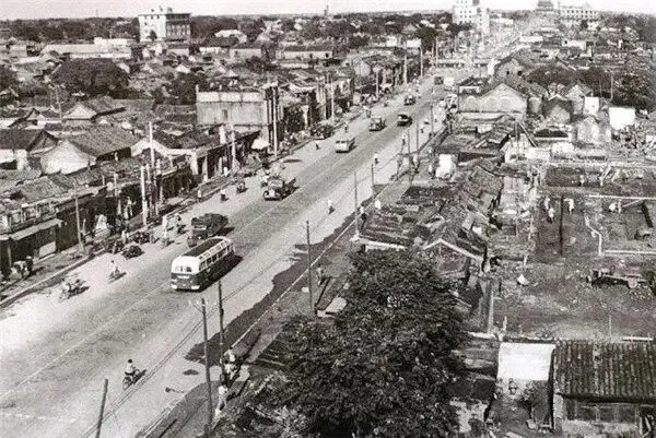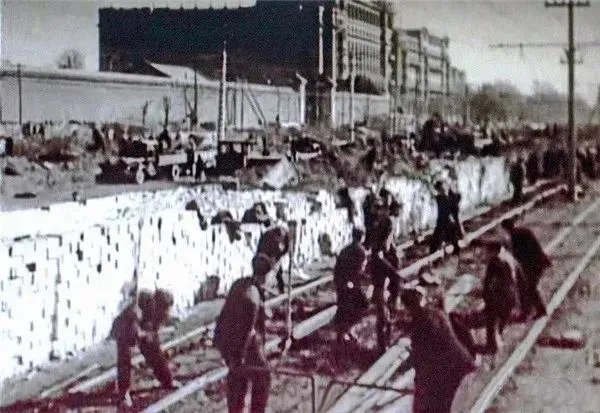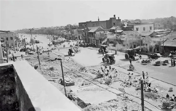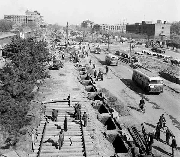 1959年,东长安街。为十年大庆重修长安街,正在拆除有轨电车道。