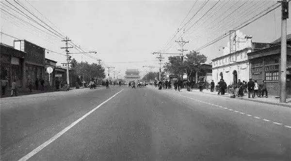 1952年,阜成门内大街。历代帝王庙前“景德街”牌楼与远处的阜成门城楼映衬出的美妙景象。梁思成赞此景在夕阳时观览,景致佳妙。可是好景不长,两年后牌楼就被拆除。