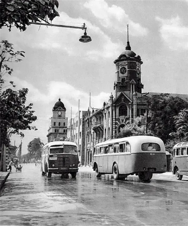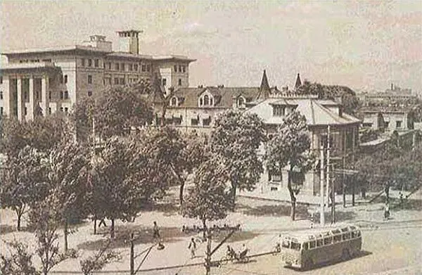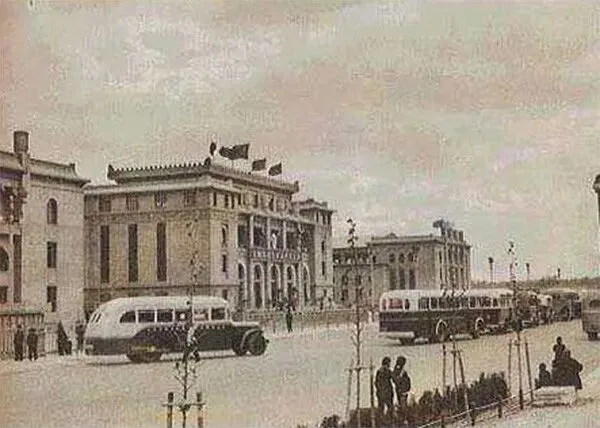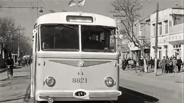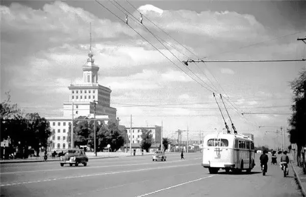 1958年,三里河路南端的中科院大楼南边的楼大屋顶被砍掉了,路上行驶的是2路无轨电车。