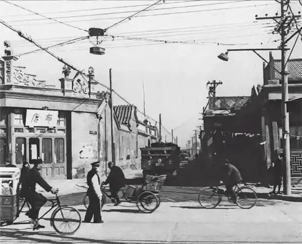 1951年,前门大街北向。可见道路上的交通工具还是以自行车和人力三轮车为主,店铺和幌子还基本保留着民国时的风格。