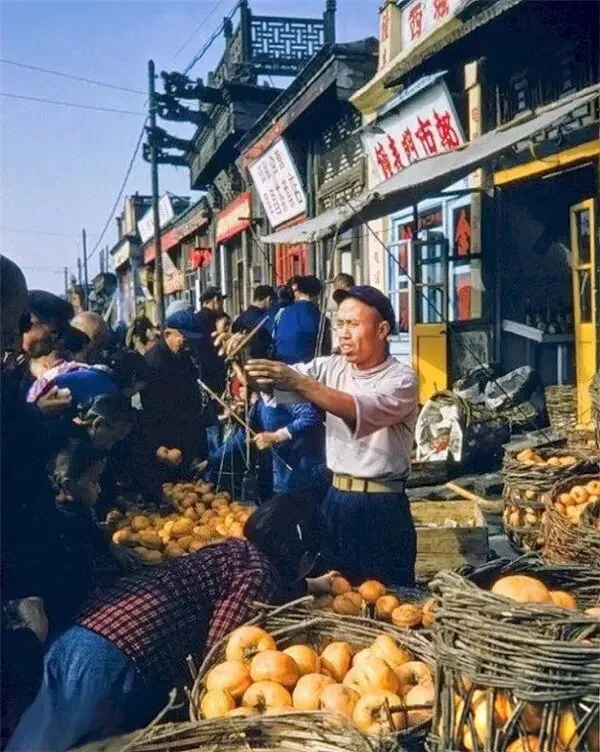 1957年,阜成门内大街一个果品商店门前买磨盘大柿子。