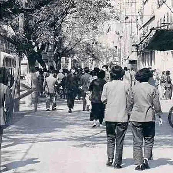 1959年,复兴路,路分上下行,中间为两排大树的分隔带。军事博物馆落成。