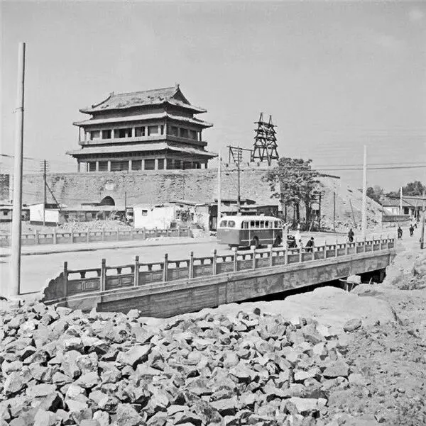 1957年,宣武门城楼东南侧豁口桥,车辆已由此进出城。主脊东侧鸱吻尚完好,北行的公共汽车是4路(已换国产五七型大轿车)小环行内环,1959年由15路取代,天桥商场开往动物园。
