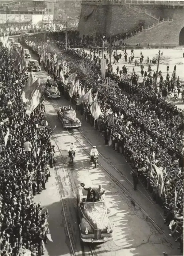 1957年,正阳门东侧路(原瓮城东侧,公安街南侧)。毛主席乘敞篷车(苏联产吉斯)迎接苏联最高苏维埃主席团主席伏罗希洛夫访华,车队经过夹道欢迎的人群。