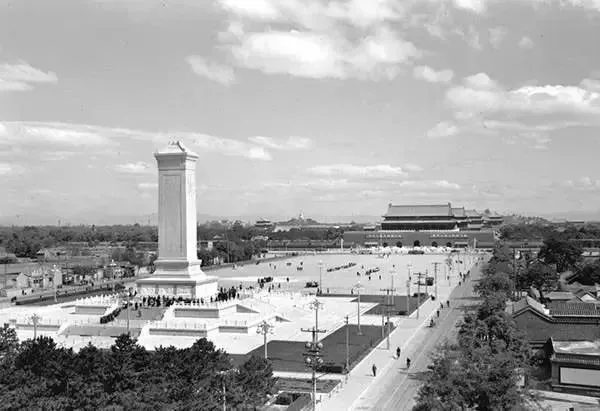 1958年,4月22日人民英雄纪念碑建成,5月1日纪念碑揭幕。纪念碑东西侧路仍为公安街、西皮市街的延续,广场基本上还是原千步廊的范围格局,这时大会堂和历博尚未动工。