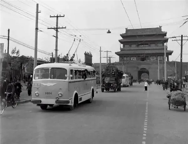 1958年,安定门内大街,安定门城楼南侧。南行的无轨电车是新开通的4路,由安定门开往崇文门,1959年改由和平里开往广安门。