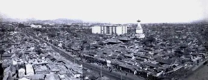 1959年,阜城门内大街。这是在赵登禹路口东南角新盖的大楼(好像民主党派在里面,海关总署也呆过)上面拍照的,可见妙应寺(白塔寺)山门。
