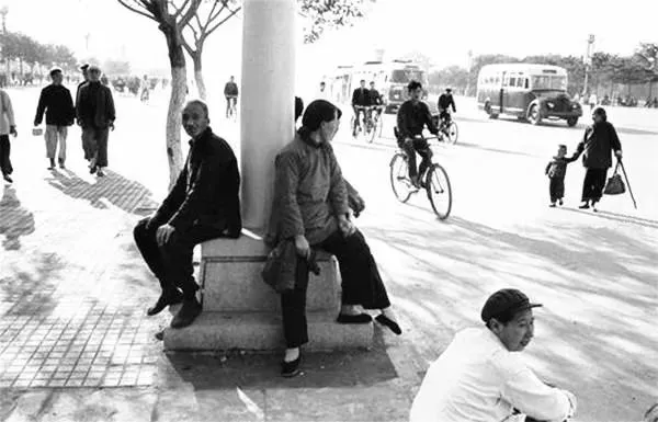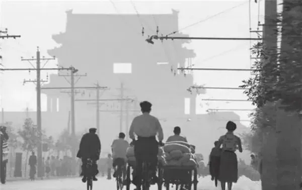 1958年,阜成门外大街,背景是阜成门城楼西面,早晨逆光向东拍摄。可见已架设无轨电车电线(1、3路通过这里),阜外大街朝向城楼南侧豁口。