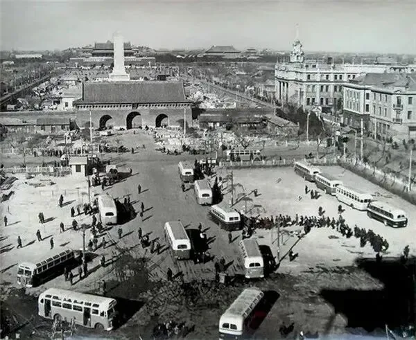 1958年,中华门棋盘街,人民英雄纪念碑与中华门短暂共存的时刻。棋盘街内是前门公共汽车站,此时7路,9路,20路以此为终点站。纪念碑刚落成,天安门广场大规模扩建前,中华门的最后遗像。