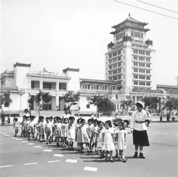 1959年,复兴门内大街。女交警护送儿童过马路,在新落成的民族文化宫前。民族宫也为建国十周年献礼的十大建筑之一,明朝三法司遗址。
