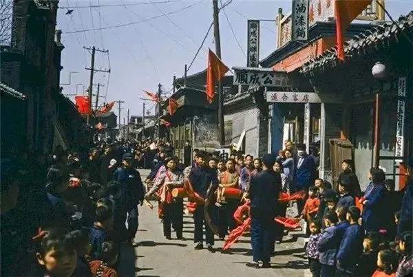 1959年,廊房头条(前门区),欢快的群众打腰鼓庆祝国庆十周年。