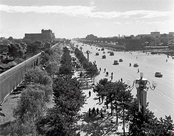 1950年,西长安街六部口路口(府右街南口)北向,可见中南海西南角的皇城墙。