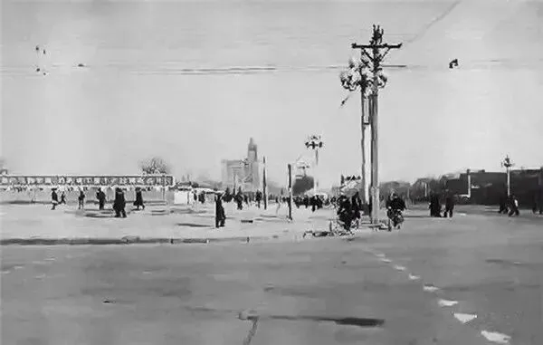 1958年,西单路口东向,西长安街-复兴门内大街已展宽贯通,庆寿寺双塔已拆除,电报大楼即将竣工。