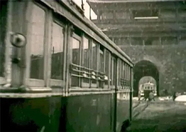 1959年,西直门内大街,驶进总站(瓮城内)的有轨电车。此日后,内城有轨电车全部停止运营。