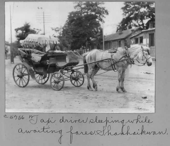 这两张照片应出于同一次拍摄,定格的是山海关教会医院(Dr.Keeler's hospital)门前车水马龙的情景。图1照片的说明:C 3834 Dr. Keeler's buggy and Northern Chinese cart. Changli.意为: C 3834 基勒医生的马车和中国北方的马车,昌黎。图2照片的说明:C 3835 An American buggy and Peking cart in front of Dr. Keeler's hospital. Changli, Shanhaikwandistrict. 意为:C 3835 基勒医生医院前边的一辆美式轻便马车(buggy)和一辆北京式马车,昌黎,山海关地区。在照片的场景中,美式轻便马车(图3)对着医院的大门口,其是一辆单座人力车(图4),其右是往来的北京式马车,都是看病来的车辆。此外,照片右侧是卖东西的,售卖对象应是前来看病的人们。