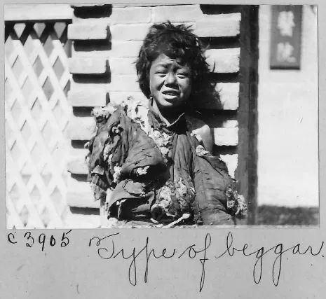 有一张编号为C 3905的照片(图5)可佐证这里的确是医院。图5照片英文说明:C 3905 Type of beggar. 意为:典型的乞丐(花子)。在图1、图2中,这个人疑似站在医院大门柱边上。在本照片中,他背靠医院西大门柱,门柱里边墙上的标牌用汉字写着写着“醫院”(医院)。