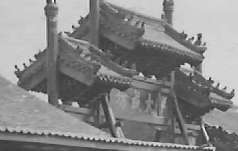 一张编号12010的照片(图7)的拍摄地点和角度与图1、图2照片相同,其主题是照片中那座牌坊。通过图7照片及其说明,可进一步判断其拍摄于山海关城内的大成坊。不过,图7照片拍摄时间早于图1、图2,应是教会医院开办之前拍的。图7照片的说明:12010 Memorial arch facing Methodist Compound. Shanhaikwan. 意为:12010 美以美会传教站院落对面的纪念牌坊。将图照片放大,可见牌坊匾额上写着“大成坊”(图8)。那么,山海关城里有大成坊么?山海关美以美会传教站在大成牌坊对面么?