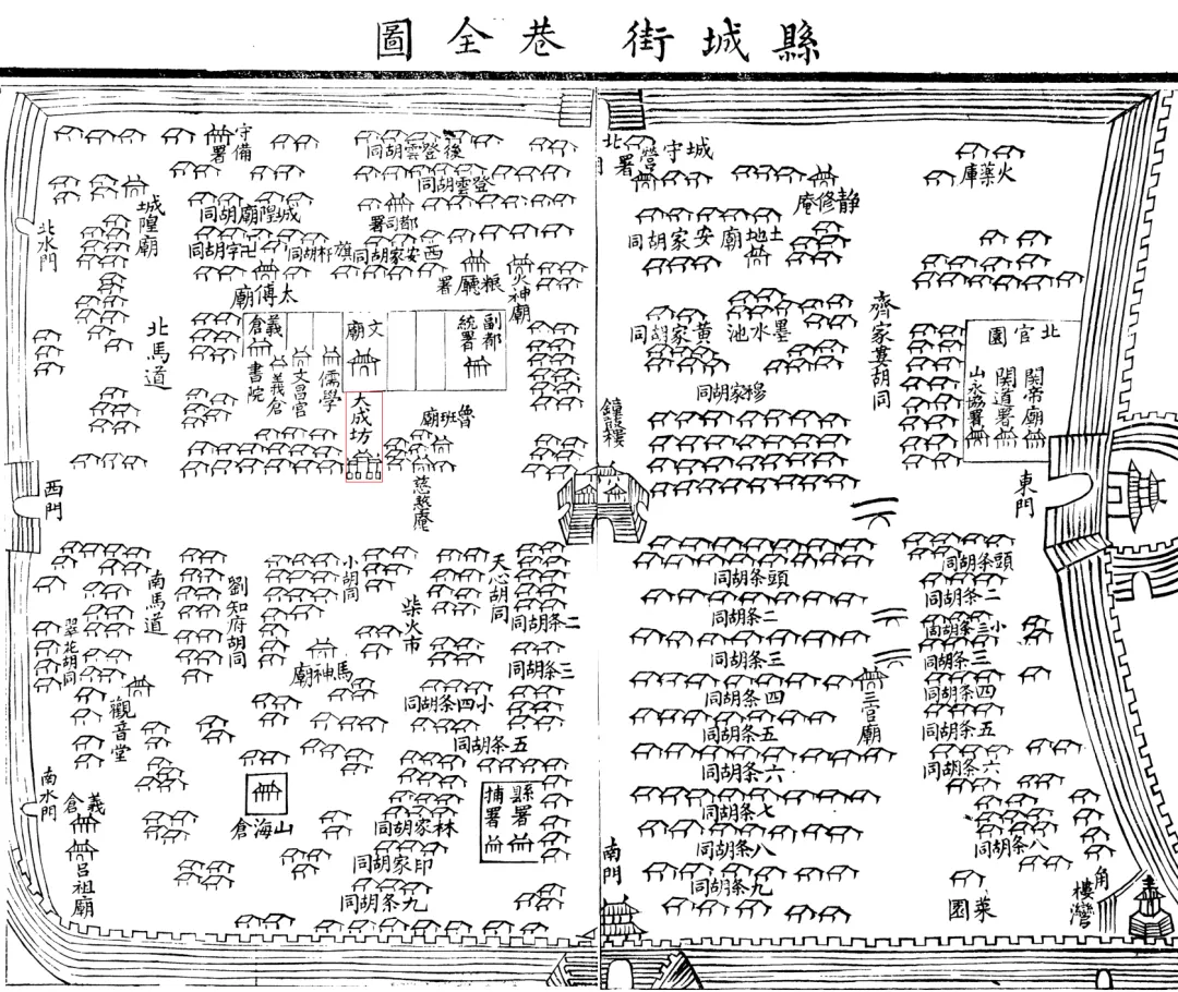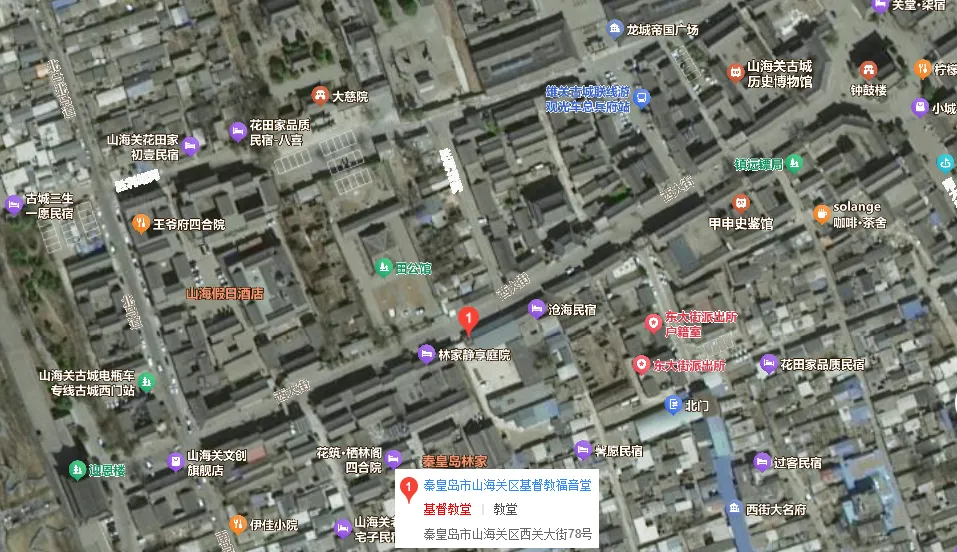 山海关城里确有“大成坊”牌坊,也确在基督教会对面。山海关是曾是临榆县的县城,光绪《临榆县志》中“县城街巷图”显示,大成坊在山海关古城西大街中段路北(图9)。查百度在线地图APP,确定山海关基督教院落位置(图10)确在山海关古城西大街中段路南。这和图7照片的说明是吻合的,且基督教会医院东邻大成坊。不过,路南基督教福音堂还在,而路北大成坊大约于1953-1953年间因年久失修被拆除了。