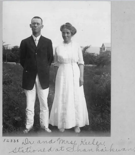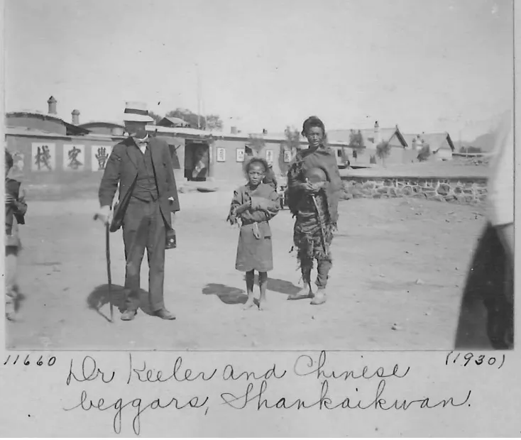 1994版《山海关志》中也有记载作为佐证。其中记载:“清光绪十五年(1889),基督教山海关卫理会成立,并在西关白桥子广场建基督教堂福音堂 1座,由城内北街吴姓牧师主持教务,吸收教徒。二十六年(1900)教堂被毁。二十八年(1902),在西大街重建教堂,即基督教卫理会山海关福音堂。民国11年(1922),由一名美国牧师掌管教会,美国牧师在北街行医,通过教会医院发展会员。” 基督教传教士拍的照片中可以找到医院Keeler医生的照片(图11、图12),图11照片是Keeler医生和Keeler护士的照片,图12照片是Keeler医生和乞丐的照片。