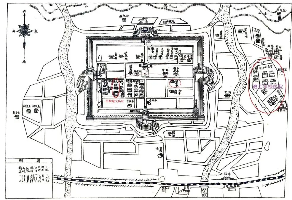 图9 昌黎县城中的文庙、基督教福音堂和教会医院位置示意图