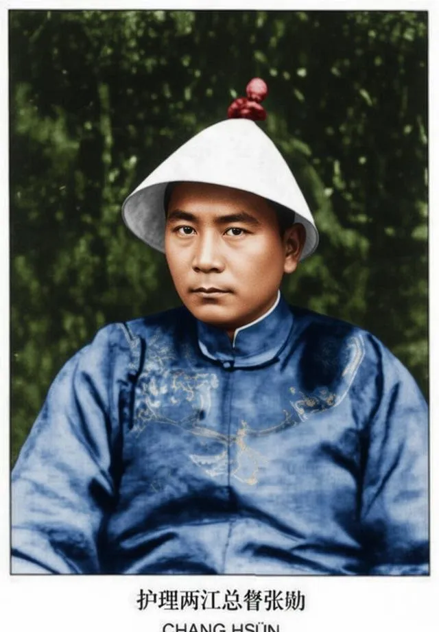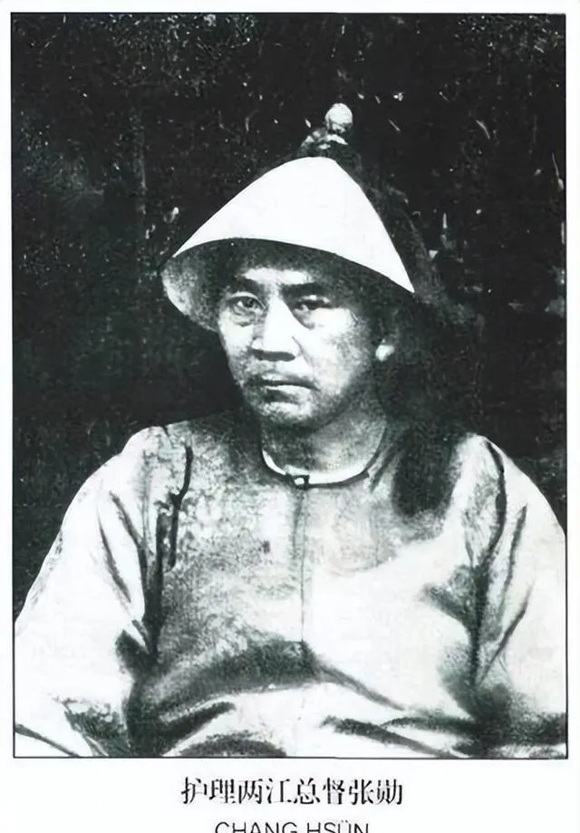 最后说这俩照片里正襟危坐的,是张勋,外号“辫帅”,两江总督的那时候,穿着蓝缎官服,帽沿下拉出一条长辫,跟旁的总督都不太一样。