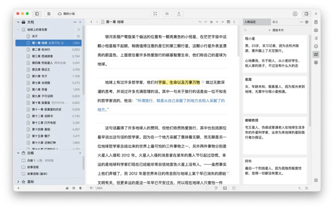 此外,应用还提供白板、卡片列表、大纲视图、一键排版等实用工具,辅助作者高效规划思路、管理灵感与掌控写作进度。