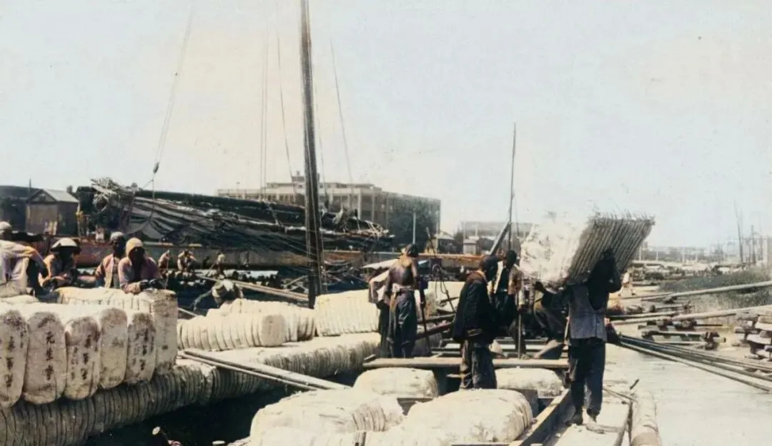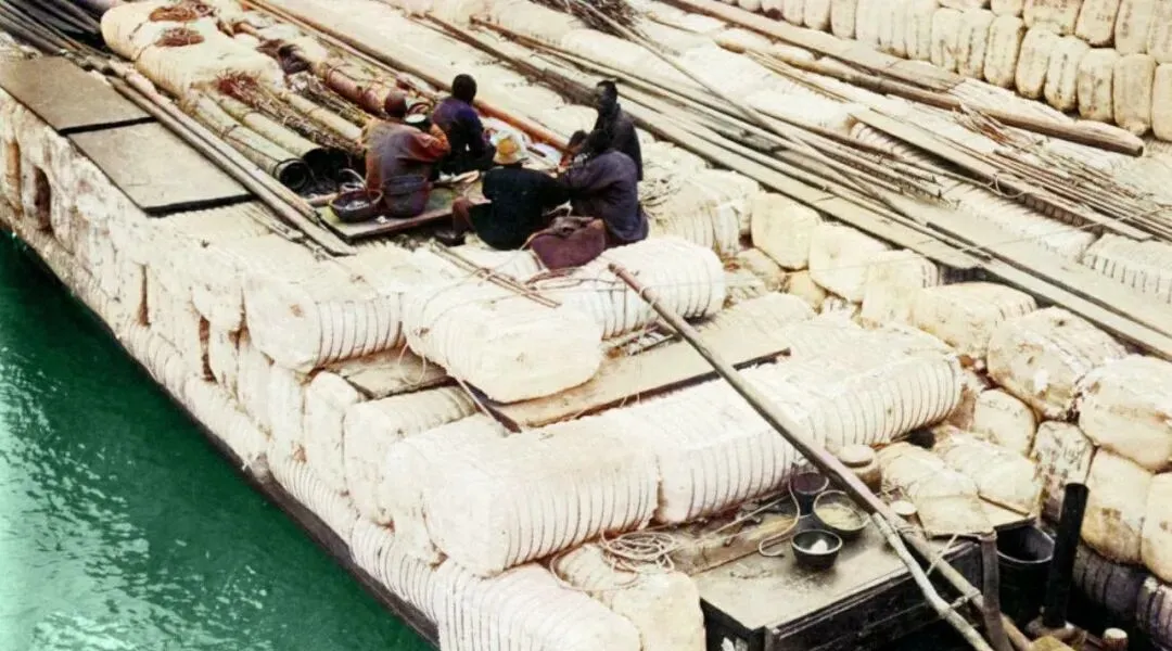 图里的白疙瘩是打成包的棉花,码头边一捆捆靠着,工人蹲在包上吃口干粮,筷子敲铁碗咚一声,另一张里有人把一整包扛肩上,脚下跳板窄,河水绿得发冷,我爸看了直摇头,说那时候干活讲的就是一口气,如今卸货靠吊机,腰也能直一点。