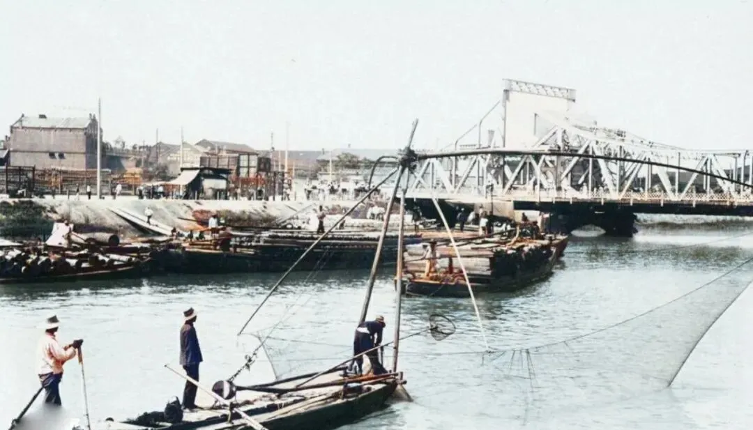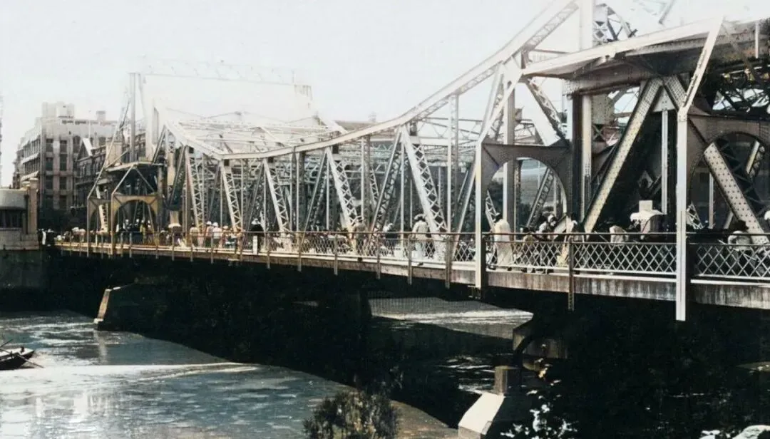 这座桥叫万国桥,铁骨架把河面切成几段光,行人拥着走,桥下水滑过去,旁边木船上有人抡起长竿把网抛开,扑通一下,孩子们凑到栏杆缝里看热闹,旧时辰里桥要开合让大船过,现在再过桥,车一脚油门就过去了,谁还记得那两声笛子样的提示音。