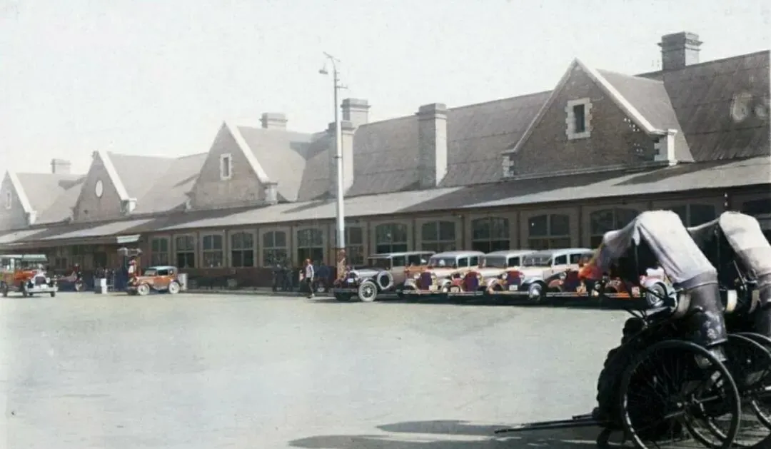 这排尖顶屋是东站前的景儿,候车处外面停着一溜汽车,车身圆滚滚的,司机靠着门抽烟,远处一辆黄包车歪着放,我小时候第一次进大站台,听到广播心里咯噔一下,旧照片里没声音,可你能从排队的影子里听到催促。