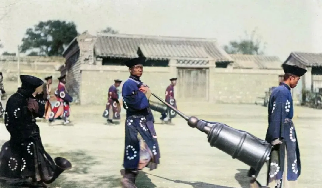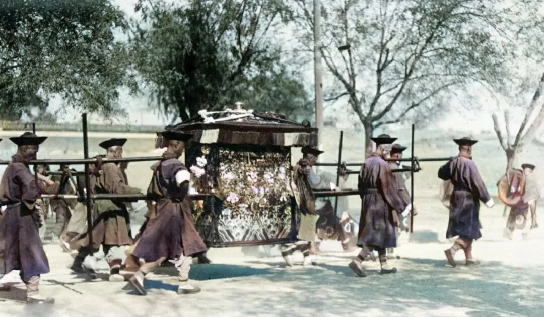 这两张是婚嫁队伍,前一张是花轿,轿帘上绣着花,抬轿的人脚步一齐,锣鼓从前面打过来,后一张有人拉着个长柄的大器物,纹饰冷冷的,好看也沉,外婆笑,说那阵子嫁女儿要体面,讲究一条街都得知道,现在哪家不省着来,热闹换成一桌饭和一段视频。