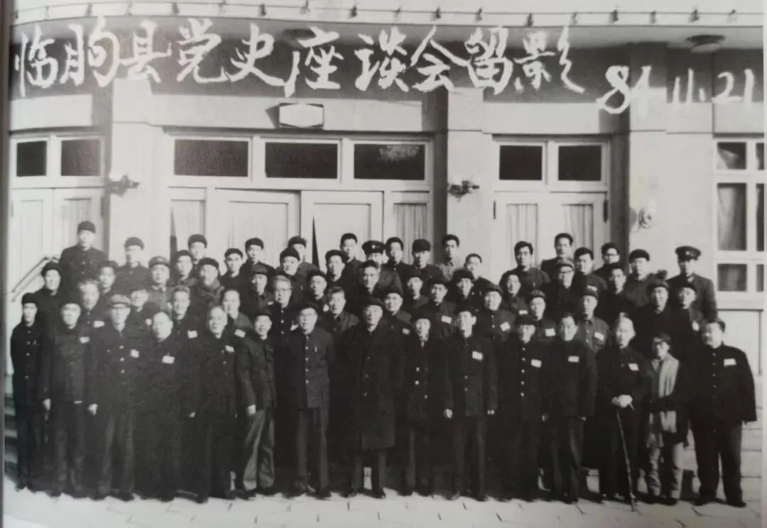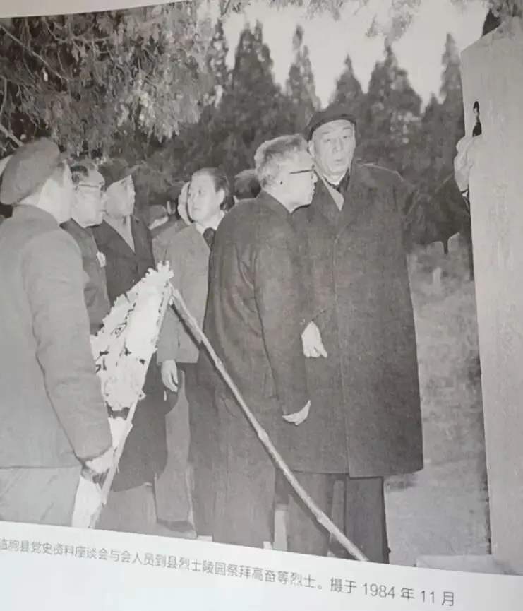 我仔细阅读了该书精选精编的670多幅老照片,其中1984年11月21日《临朐县党史座谈会留影》照片,引起了我的极大兴趣:近40位老前辈中,赵家楼村就有6位:高启云、王健、高辉、丁珉田、胡军、高延寿。参加座谈会人员还专程赴县烈士陵园祭拜了高奋等烈士。