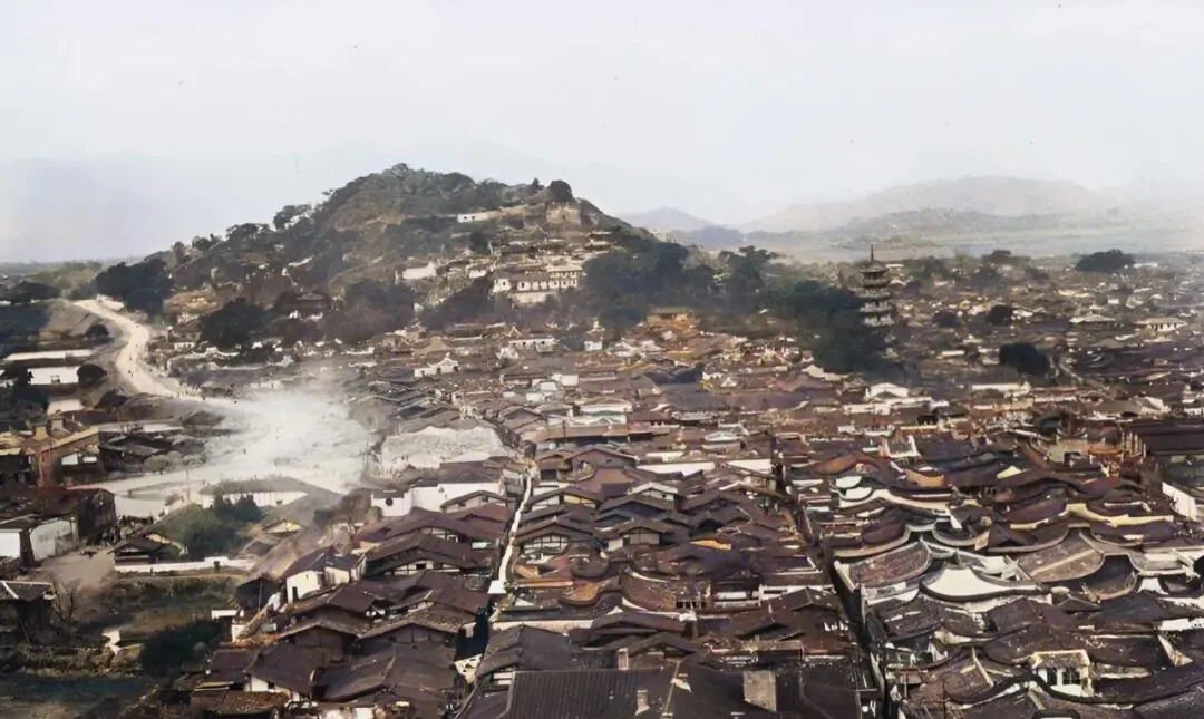 图中这一大片屋脊挤得紧紧的,叫榕城旧景,瓦色深沉,檐口起伏像潮水,前头那座不太高的山便是乌山,右侧缝里露出一截塔影是乌塔,这类俯瞰照最能看出城的骨架,主街像一条白脊梁从屋海里穿过去,老辈人说,晴天一早烟囱齐冒,像城在呼吸。