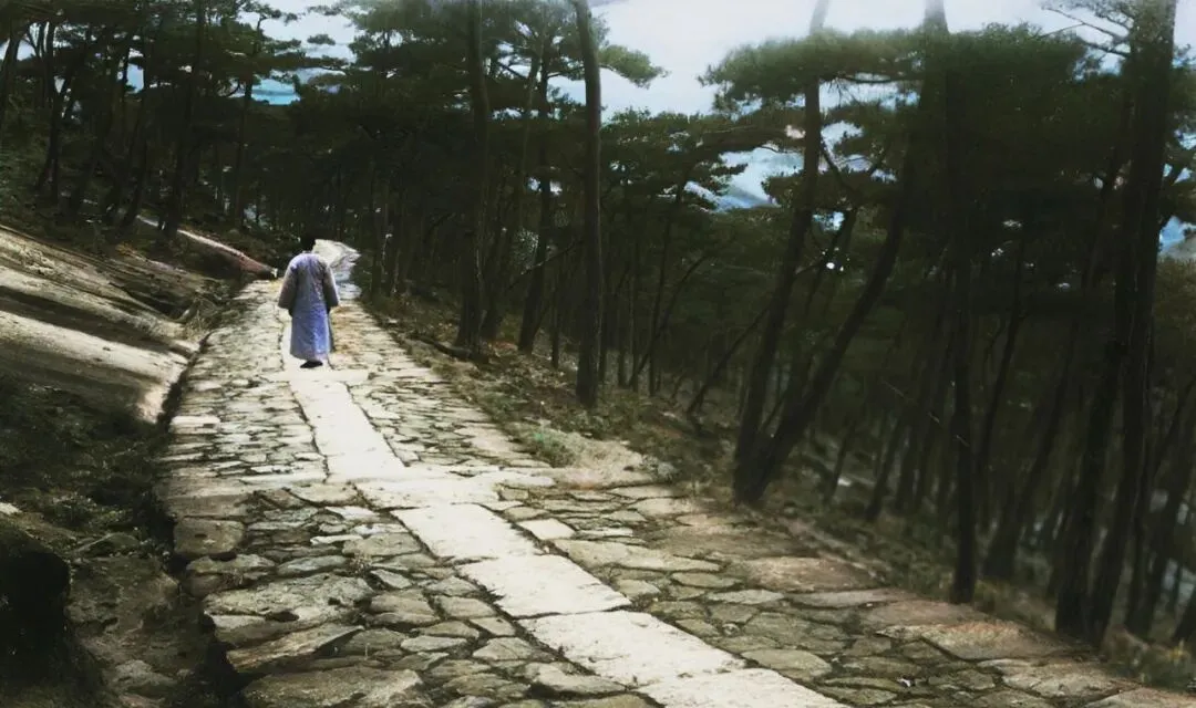 这条石板路是鼓山路,青石一条白一道拼着往山里钻,人影细细一根,身上披着长衫,风从松林里穿过,呼啦一阵像有人在耳边低语,走到半山腰听见鸟叫,脚下石缝里渗着冷气,回头看城,像被一只手轻轻按住不动。