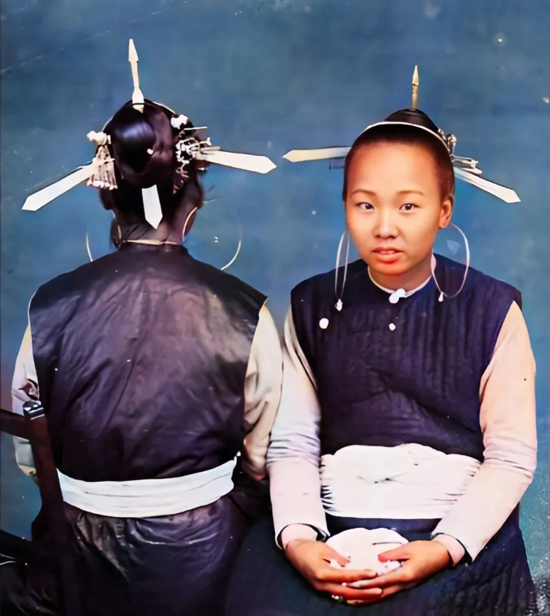 图中女子头上的银亮物件叫三条簪,也有人唤三把刀,长长短短穿过发髻,发顶一支像小矛,耳畔再坠一圈大环,显得利落又俏,妈妈看见照片打趣,说这装饰不光好看,路上遇事还能挡上一手呢。