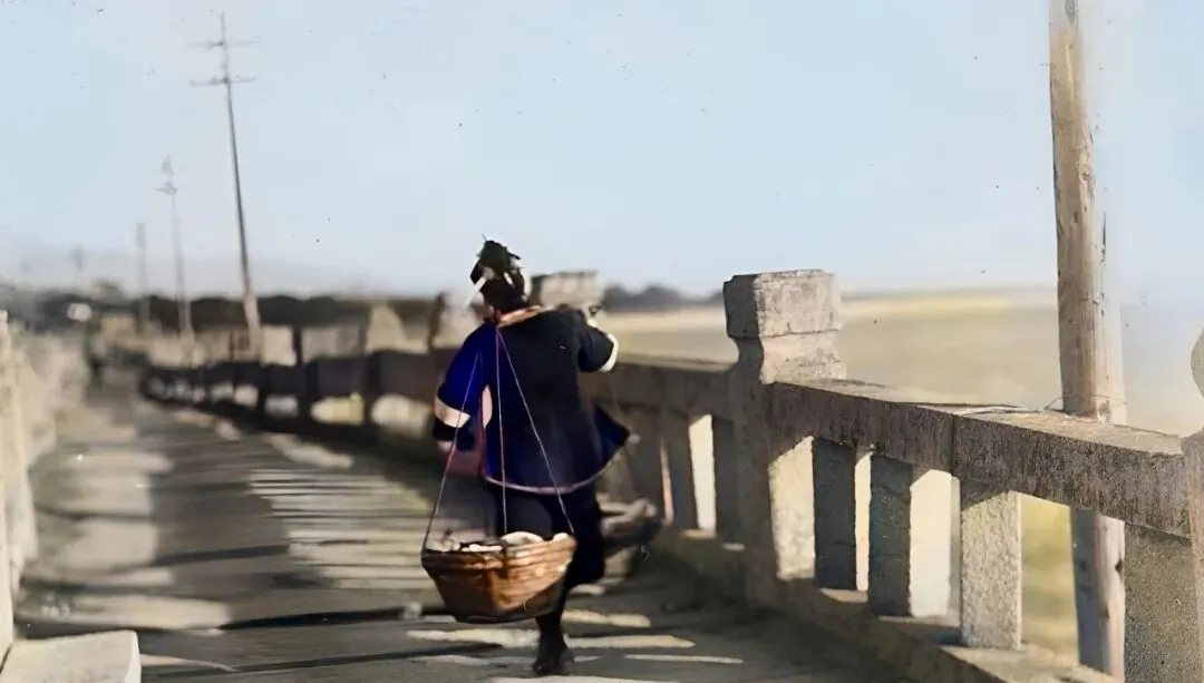 这一位挑着箩筐走在桥上,篮里圆滚滚多半是馒头或糕团,衣摆被风一拽就向后飞,桥面石栏一格一格,影子斜斜拖长,小时候跟着大人赶集,远远听见担绳吱呀,心里就开始打鼓。