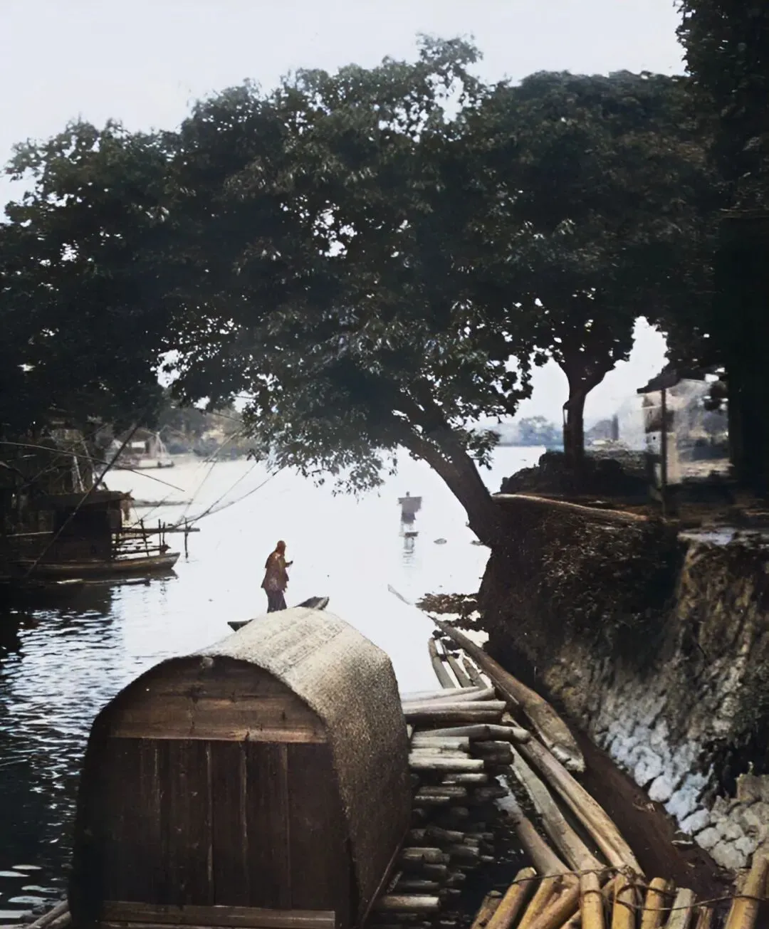 这张江面上飘着的长方形是木排放运,几个人站在一块排上,旁边篷船相伴着行,孩子靠在舷边看热闹,篙一摆,水花就蹿到太阳底下,亮得晃眼,那时候靠水吃水,现在车路通了,木材大多陆上走。