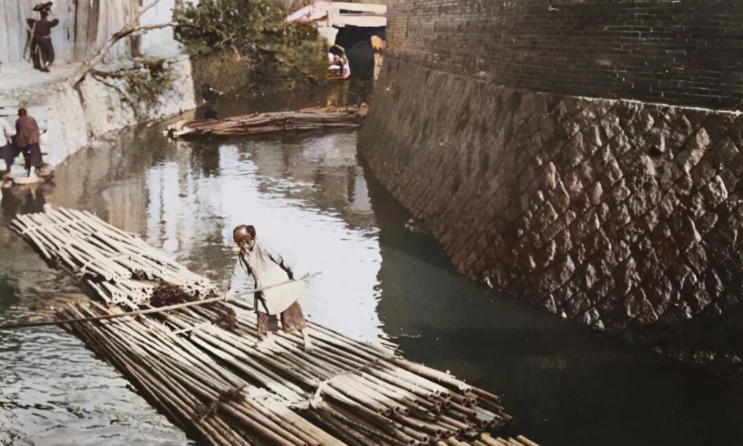 图里老汉踩着的是竹排,前后用藤索捆得紧,篙头一按,水纹从排缝里挤出来,城墙根下水色发暗,经过桥洞的那一下最考手劲,爷爷说,这活看着轻巧,实际上脚底下得站稳,风一拧就打横了。