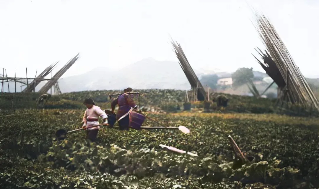 这个场景熟,叫菜农浇地,扁担上挑着两只大桶,桶嘴细长,水线像银丝顺着落到根部,地里绿油油一片,远处插着一束束高竹,像旗子一样在风里晃,汗珠从额头滑下去,衣襟贴在背上也不管。