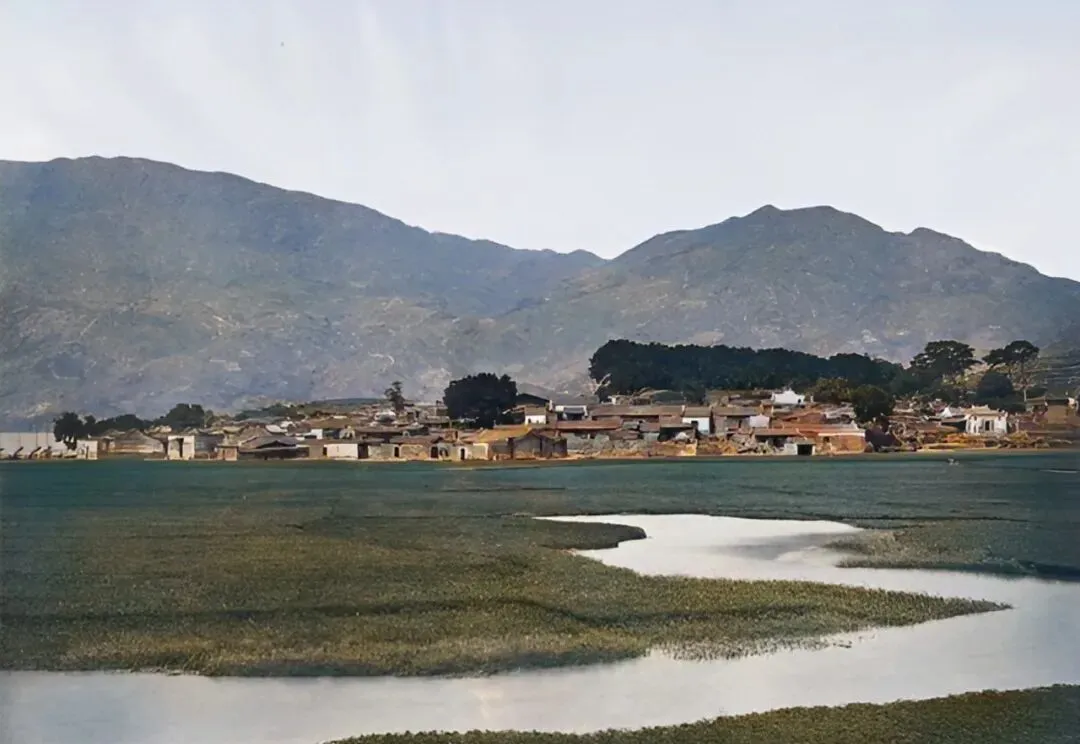 这片安静的房舍是江滩村,前水后山,水面漂着一层细细的绿,风过时起小涟,屋后几棵黑松站得稳,村口晒着谷,远处烟线慢慢升上去。
