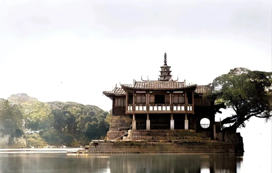 水心里这一座是水榭亭台,台基呈层层台阶,亭身抬得高高,四面都透,细柱撑着屋顶,正中还立着小塔,湖水把影子照得直直的,风吹一抖,影也跟着碎。