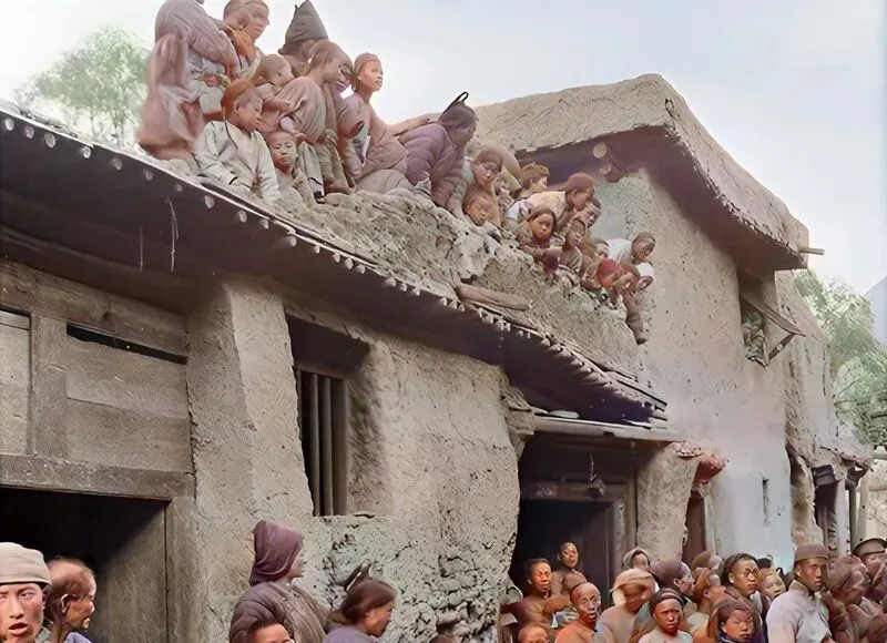 这堆人挤在屋檐边,图中这场景叫看稀罕,泥坯房墙面起了裂,孩子们趴在檐口,眼睛跟着人群转,听口音像外地商队或戏班过街,小时候我也爱往人堆里扎,娘在后头拽衣角,说别往上爬,掉下去不认人,今天手机屏一刷啥都能看,热闹到手边,真到街口,反倒安静了。
