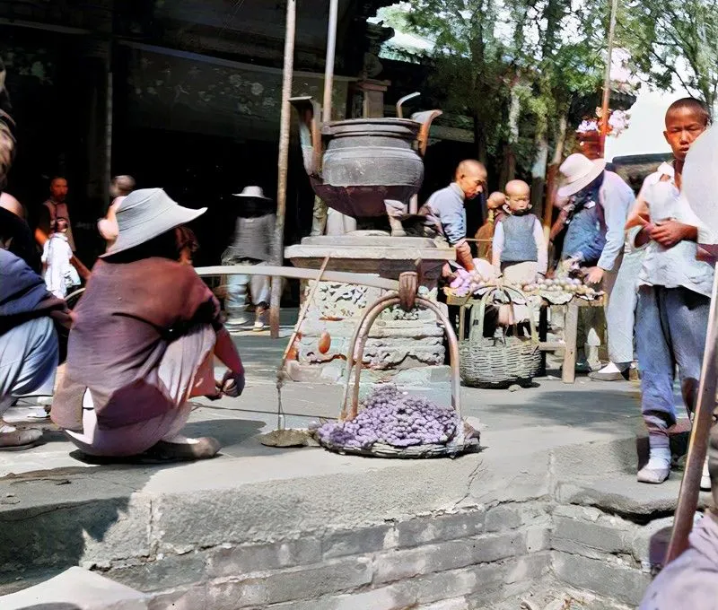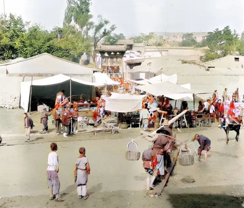 这个热闹处叫庙滩子,白布搭成的棚影一片片,担子压在肩窝,筐里葡萄紫得冒油光,孩子在泥地里画道道,卖货的喉咙吆喝到哑,阴凉底下一壶老茶,来人搪瓷碗一接就走,那时候钱紧,秤砣一滚,心里就实,现在扫码一点点,手不摸钱,买卖更快,闲聊天却少了。