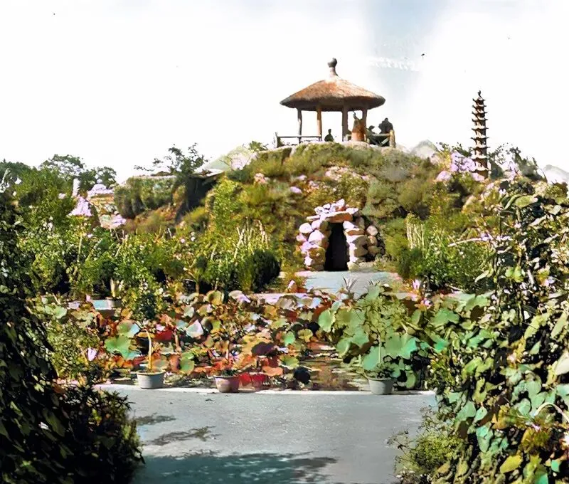 图中这堆着石头的小山包叫白塔山上的景,洞口砌成拱,草把亭子顶得圆,旁边一溜盆栽摆得精神,远处塔影细长,光线一亮一暗像在呼吸,外公爱领我们上山吹风,说站在这儿看河最顺眼,现在山道修得平,栏杆新,照相的人多,静下来的时候也还是好看。