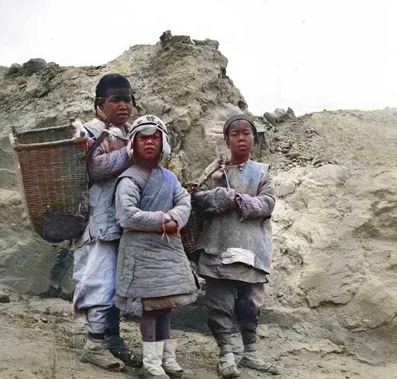这三个背筐的孩子在拾粪,棉衣鼓鼓囊囊,脚上裹着布袜,脸上的土是灰里带亮的,地里没化肥那阵子,这玩意儿就是庄稼的饭,姥爷说**“一筐下去一畦绿”**,如今机器一轰,肥料一撒,孩子放学背的是书包,田埂边只剩下鸟叫。