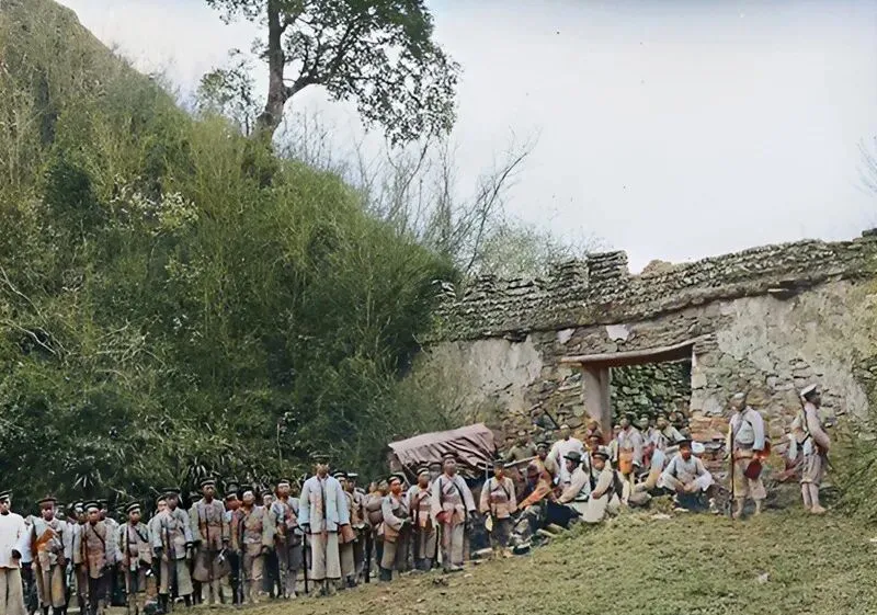这扇石砌的小门是碧口界墙的口子,门楣压着平石,墙上生着青苔,士兵靠着枪站在阴影里,旁边一顶小轿歇着脚,路从树根下拐出去,听人说过,碧口不像甘,商人挑担来回穿,口音都带了川味,现在关卡撤了,界线只剩在地图上的一条灰线。