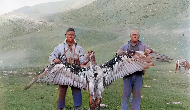 这只铺开像伞的鸟叫老鹰,两个猎人一左一右拎着翅尖,羽毛从黑到白一层一层梳得顺溜,腰上的弹袋压在皮带上,脸上没什么表情,地气从靴口往外冒,爷爷看见这种照片只摇头,说山上猛的多,敢斗的也多,现在护野的规矩细得很,见着就放,照片只当一段野史翻过去。
