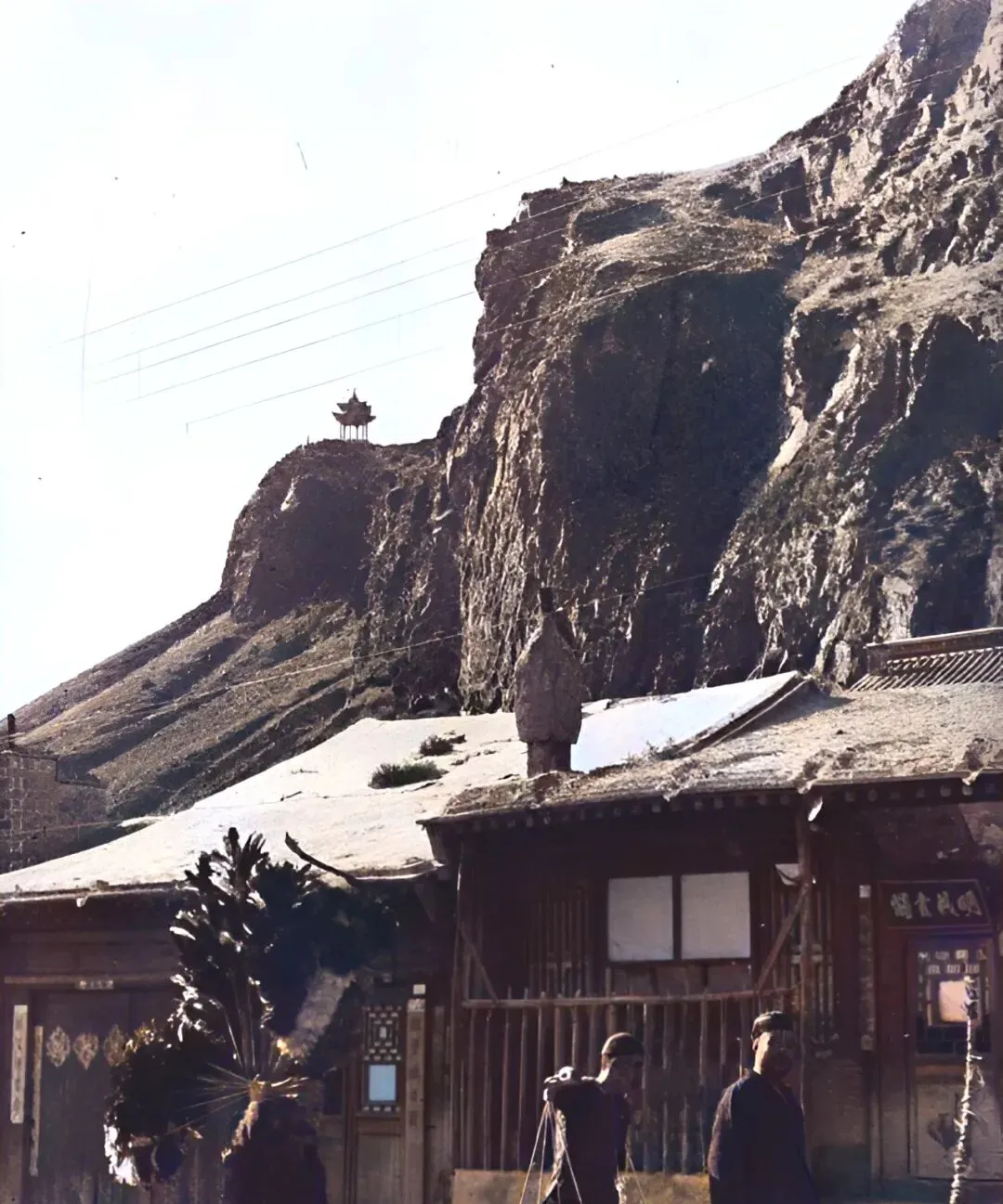 图中屋舍背着峭壁,半山腰立了个小凉亭,木檐往外挑,风把铃子荡得细细的,门前两个人挑着担子路过,抬头看一眼又低头走路,奶奶说那时候进山求个平安,烧个小香心里就稳当,现在出门手机导航一亮,脚下有路心里也有数。