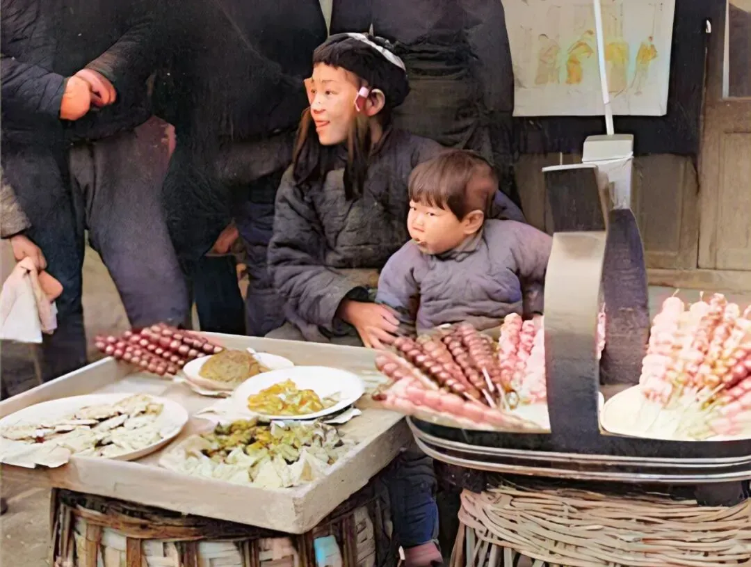图中的小摊是风怡安街的糖葫芦,竹筐上架着木托盘,红亮的冰糖一串挨一串,姐姐抱着妹妹守摊,笑着回一句“要酸一点的还是甜一点的”,硬币碰白瓷碟叮的一声,我凑近看见盘里还摆着别的点心,妈妈那会儿总说别馋,吃了就回家写字,现在想起这句管用的唠叨还在耳边。