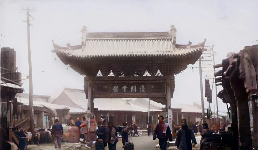 这个高挑的木牌坊上写着“边关重镇”,瓦当层层叠叠,穿行的人把包袱往肩上一挪就过去了,杆子上电线拉得直,街口的铺面挂着幌子,写着“染”“绸缎”的金字招牌,牌坊像拎着一座城的门面,一眼看过去就知道这是个要紧地方。