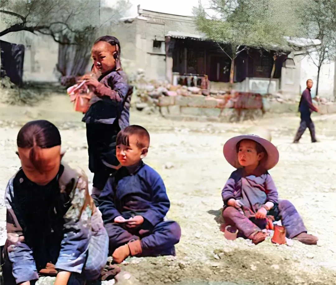 这张是村口的娃娃们,泥地上蹲成一排,裤腿上一圈土,手里攥着不知从哪找来的小铁片,阳光晒在脸上红扑扑的,远处一个人快步掠过不回头,小时候我们也是这么玩,赢了能换一个糖块,输了就拍着裤腿站起来再来一局。